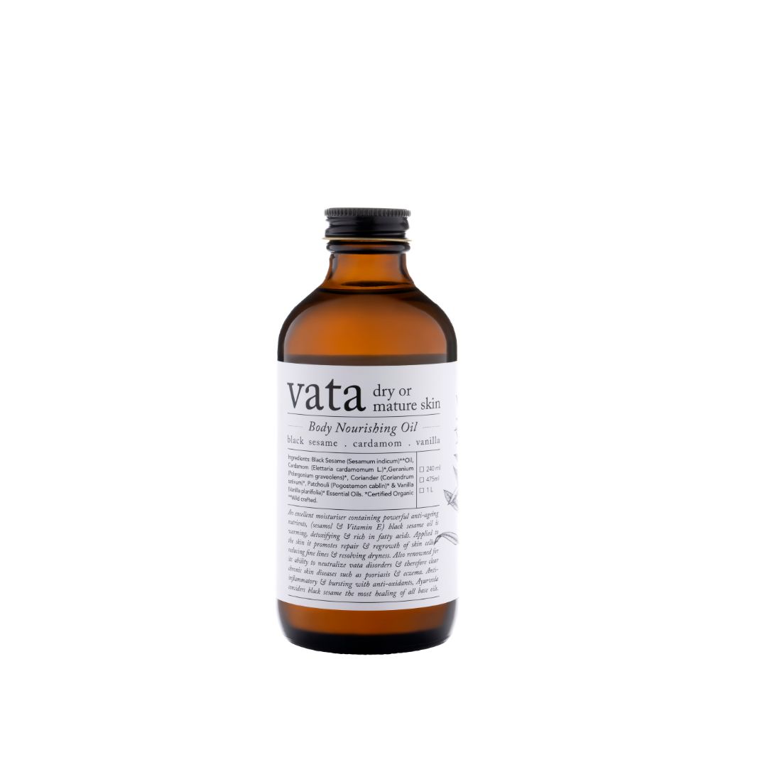 Vata Body Oil is an excellent moisturiser containing powerful anti-aging nutrients like sesamol and Vitamin E. Black sesame oil, considered by Ayurveda to be the most healing of all base oils, is warming, detoxifying, and rich in fatty acids. This 100% handmade, organic, natural skin care oil is infused with essential oils that are antiseptic, anti-bacterial, and anti-inflammatory.